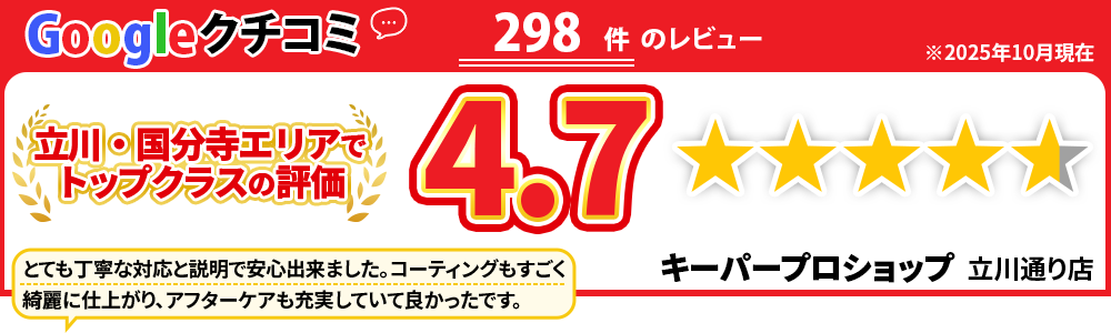 私達キーパープロショップは、立川市・東大和市・武蔵村山市・昭島市・福生市・日野市・小平市・国分寺市・国立市エリアのカーコーティング専門店として、