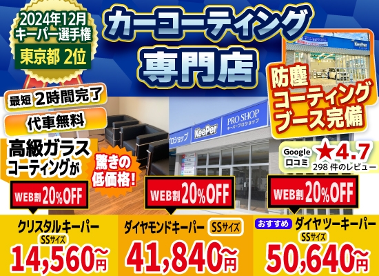 当HPをご覧になったお客様限定で、コーティングの施工料金20%割引を実施中!また、他社にはないお得な特典もお客様にご提供しております。キーパーコーティングをお考えのお客様は、是非、当店にお任せください!