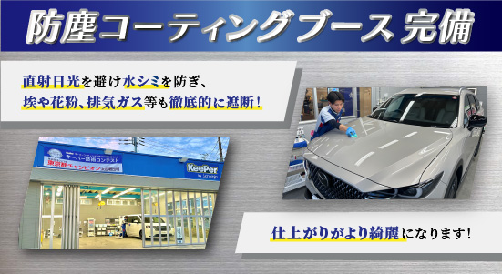 また、当店はキーパープロショップの中でも最新設備を完備しております!屋根付きのコーティング場も新設しましたので、天候に左右されずコーティングを施工することが可能です!